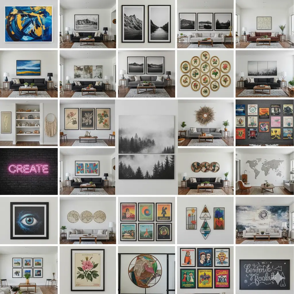 Mix canvases, framed prints, posters, and even sculptural elements in a creative salon-style arrangement. Get started with How to Create a Stunning Gallery Wall: Layouts, Frames, and Ideas.