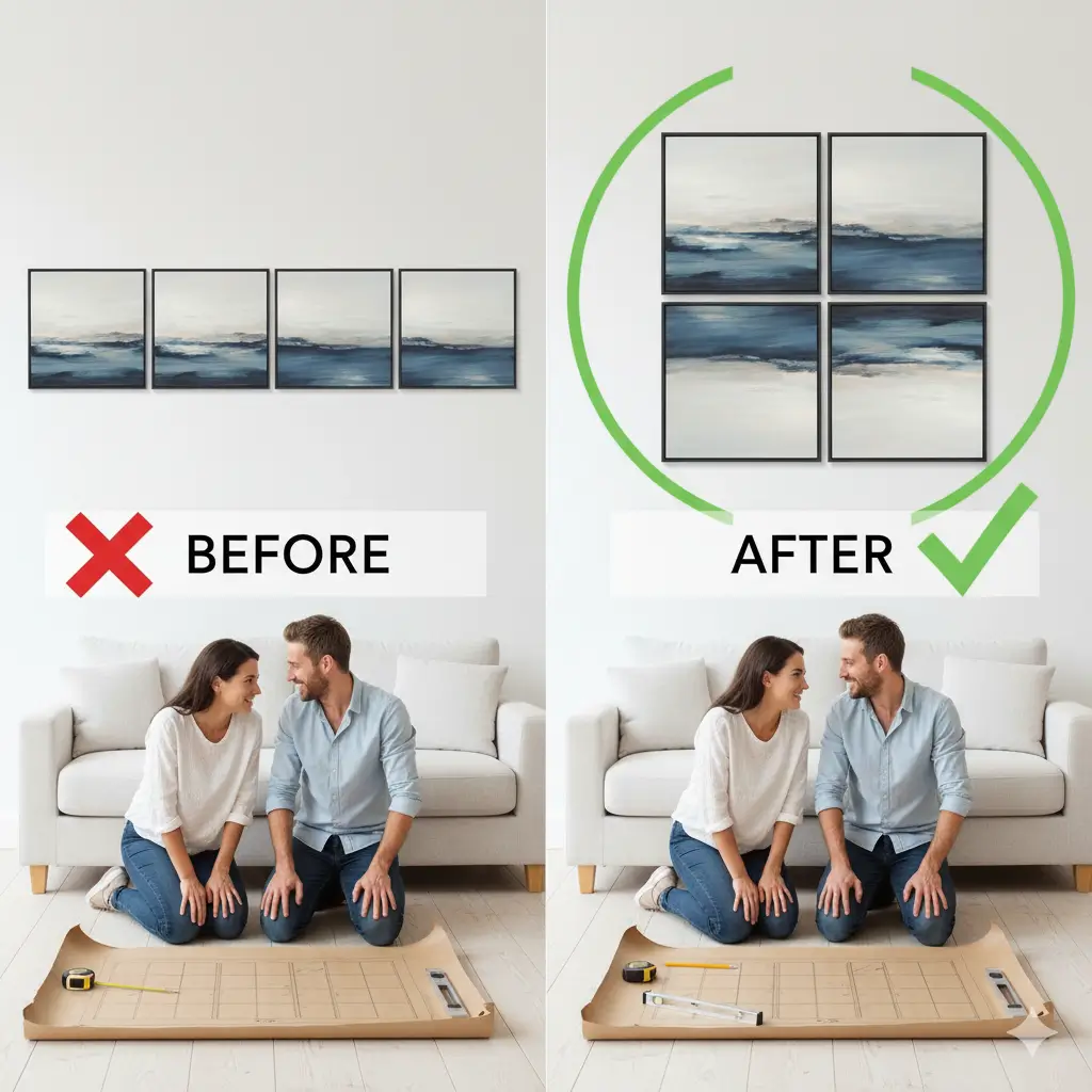 - For best impact, center the painting set at eye level—about 57–60″ from the floor to the center of the entire arrangement.